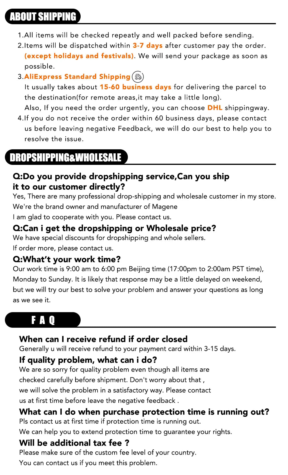 Kindly note that the shipping guide is for reference only. The shipping time are calculated by using business days and delays maybe caused by force majeure, natural disasters, inclement weather, public holidays, and factors out of our control.