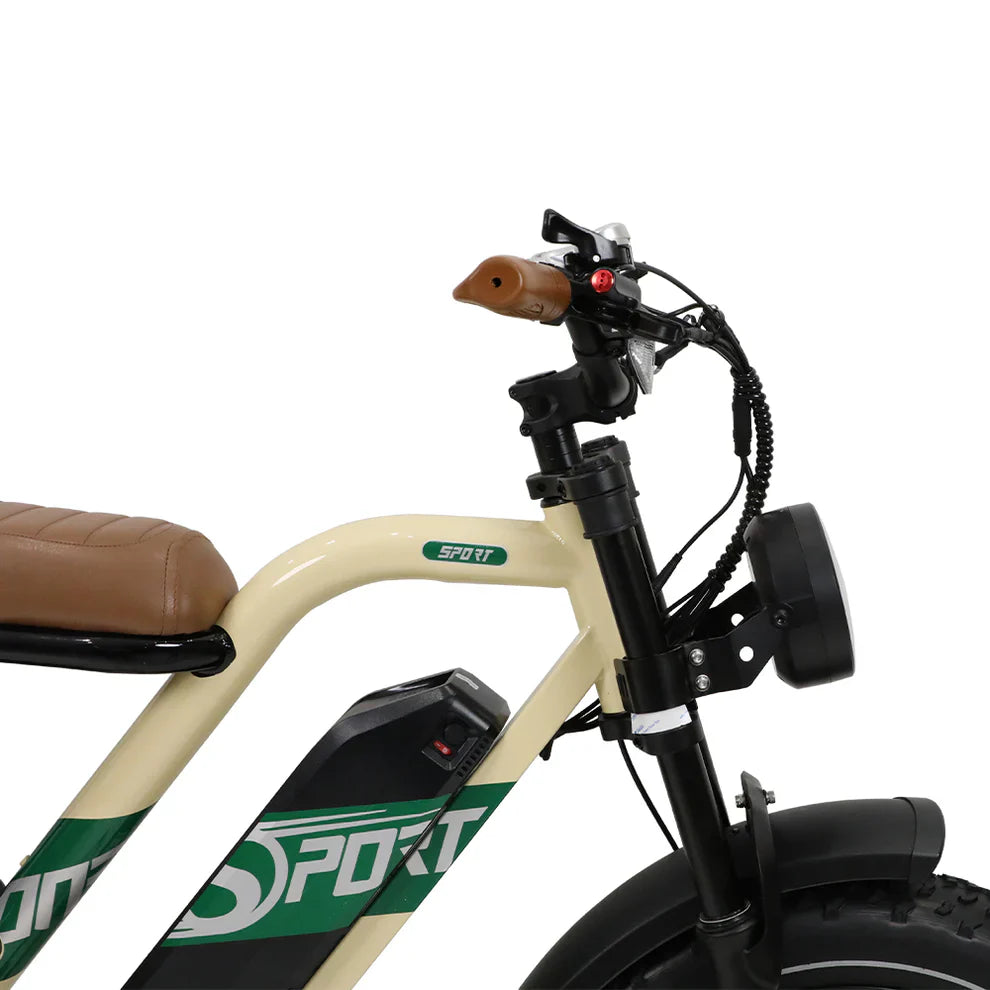 Equipped with wide 20*4 inch tires, this vintage fat tire e-bike offers superior traction and stability on a variety of surfaces. The large, thick tires provide a smooth ride, absorbing shocks from rough terrain and ensuring comfort whether you're cruising through the city or tackling off-road trails. Perfect for both urban and outdoor adventures!